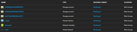 info: vm create command OKTwo things you may have observed in the log above. First, another storage account has been created. Not nice, but this could have been probably avoided, specifying storage parameters to the vm create command. Second, the NIC “nicmaster” does not have a publicIP configured, but this is no big deal for now. Let’s check in the portal what I have created so far: