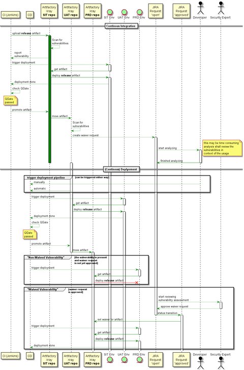 - when a release artifact is uploaded to the artifact repo, it is scanned for vulnerabilities